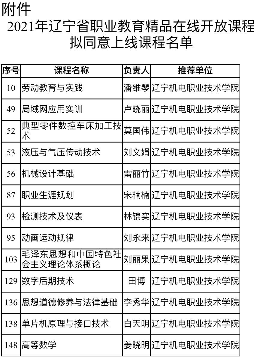 日前,辽宁省教育厅对2021年度职业教育精品在线开放课程评审结果进行了公示。由我院组织申报,潘维琴负责的《劳动教育与实践》等13门课程入选本次省级精品在线开放课程。