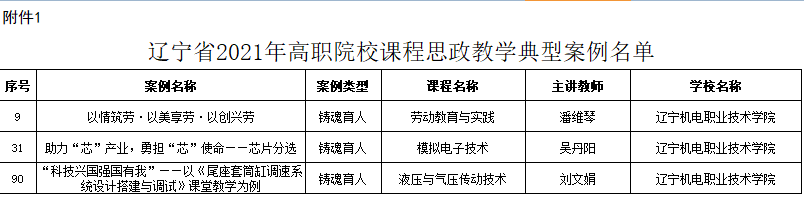 近日,辽宁省教育厅对2021年职业院校课程思政教学典型案例评审结果进行了公示。由我院推荐,潘维琴教师主讲的《以情筑劳·以美享劳·以创兴劳》案例、吴丹阳教师主讲的《助力“芯”产业,勇担“芯”使命——芯片分选》案例和刘文娟教师主讲的《“科技兴国强国有我”——以<尾座套筒缸调速系统设计搭建与调试>课堂教案为例》三个案例全部获评。